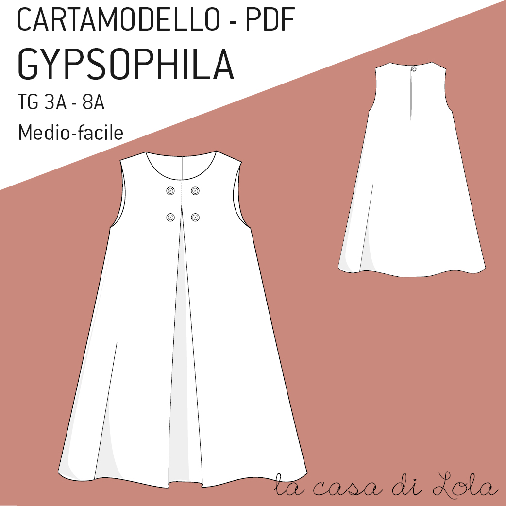 Gypsophila è il cartamodello di un abitino scamiciato con uno sfondo piega sul davanti fermato da quattro bottoncini.