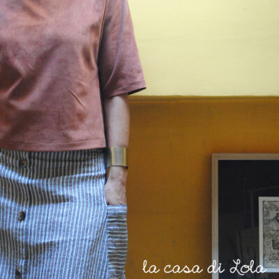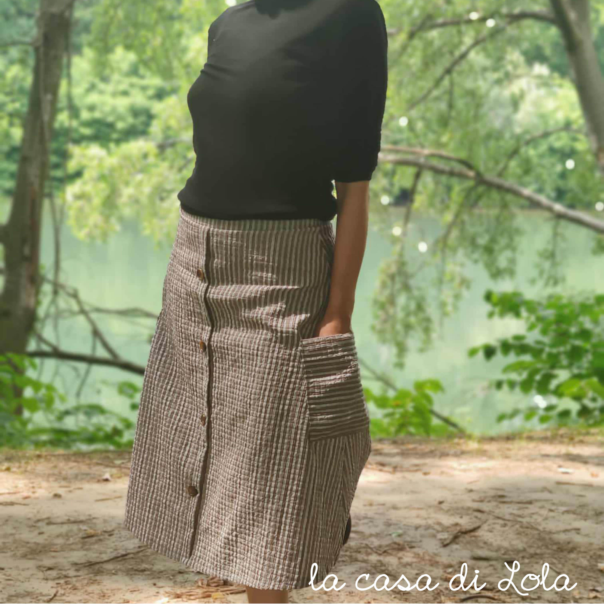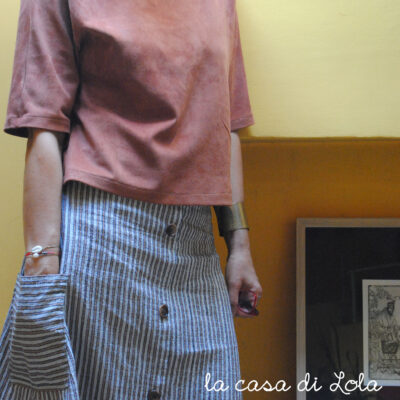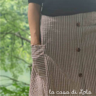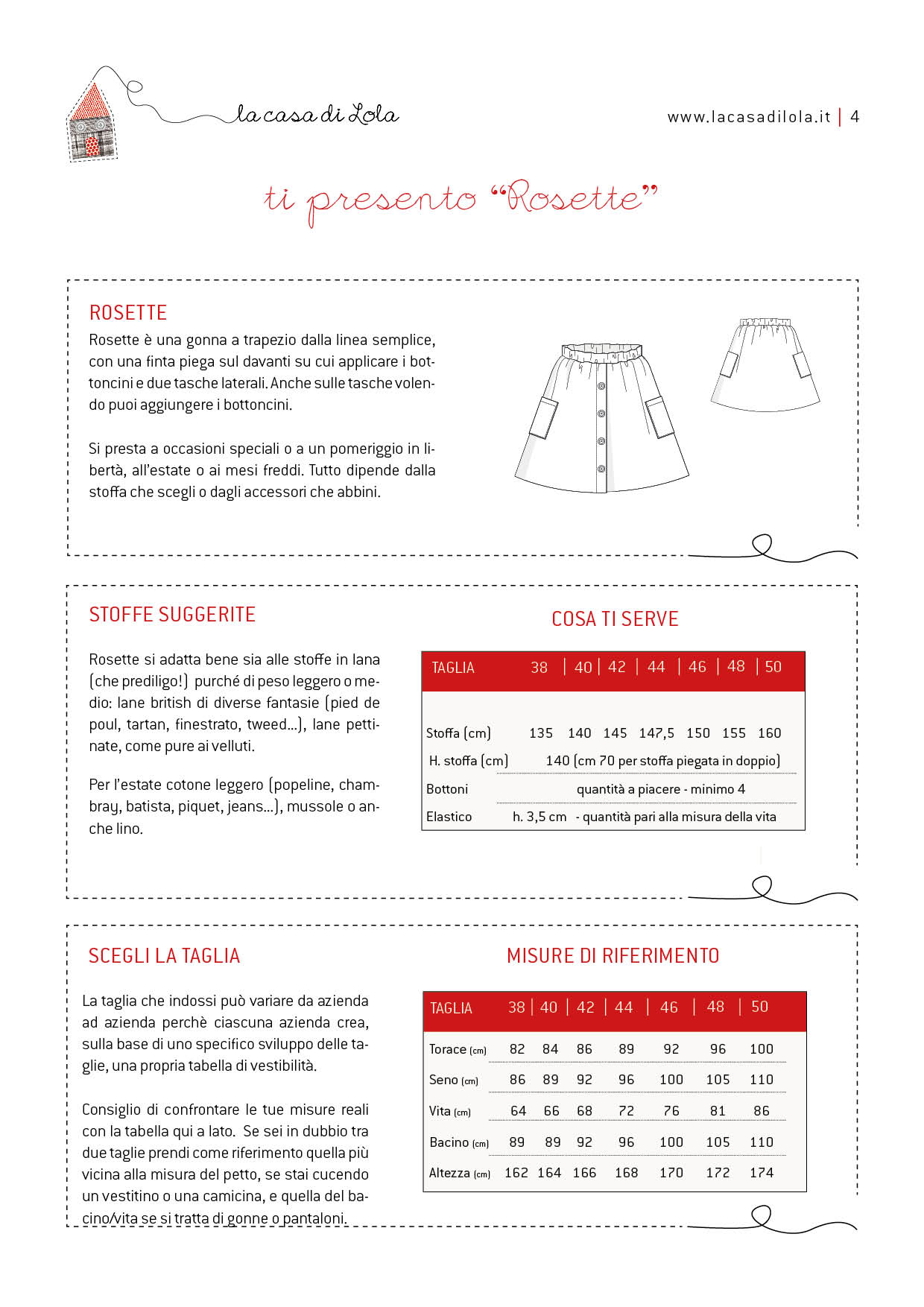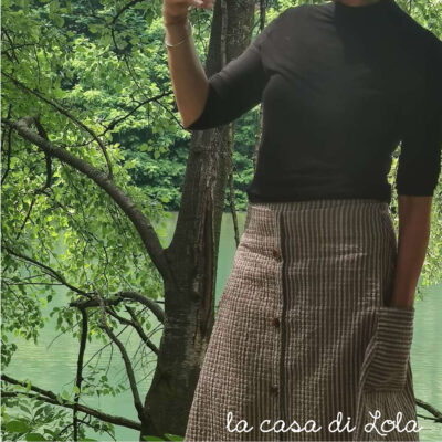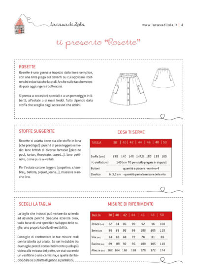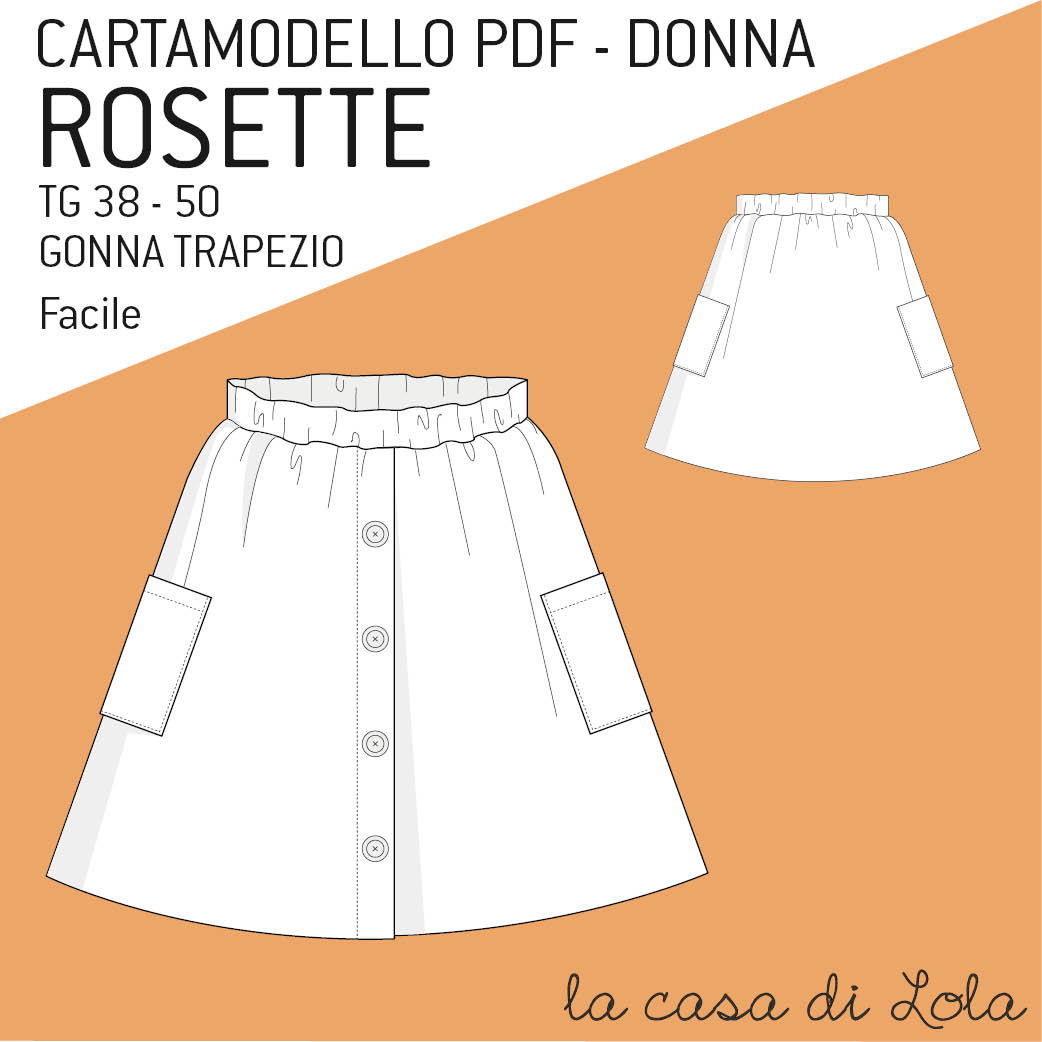 Rosette per donna è il cartamodello di una gonna svasata, con tasconi laterali e una finta abbottonatura sul davanti.